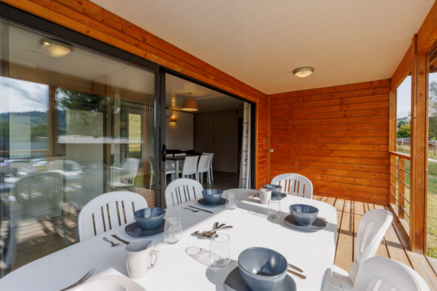 Extérieur : terrasse couverte en bois avec salon de jardin